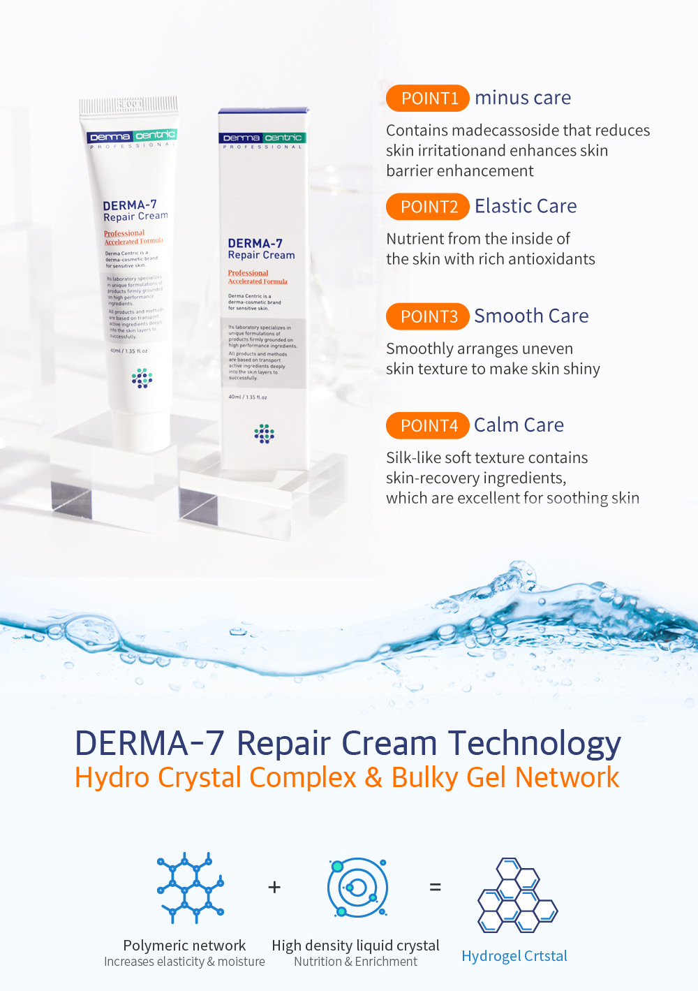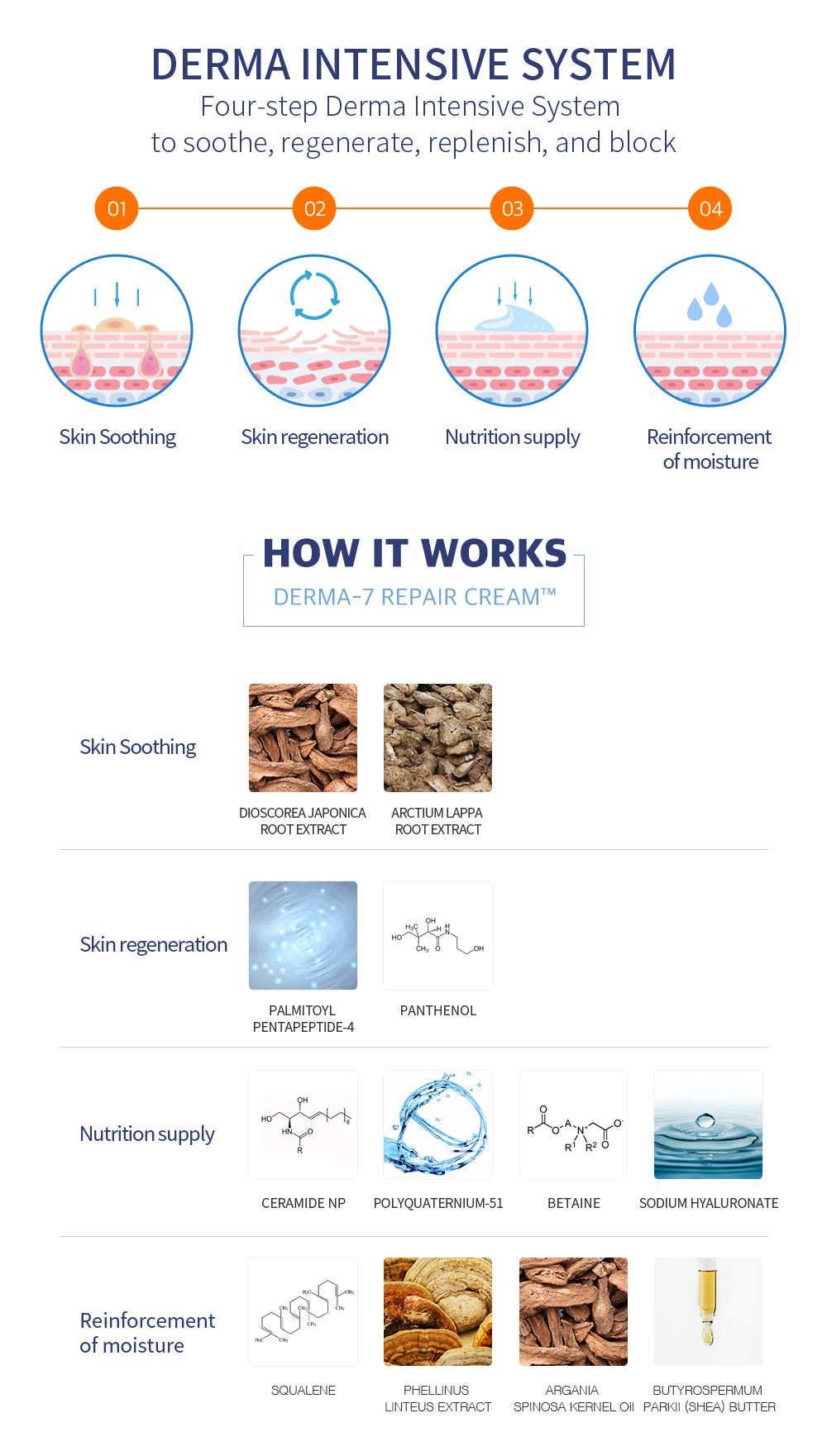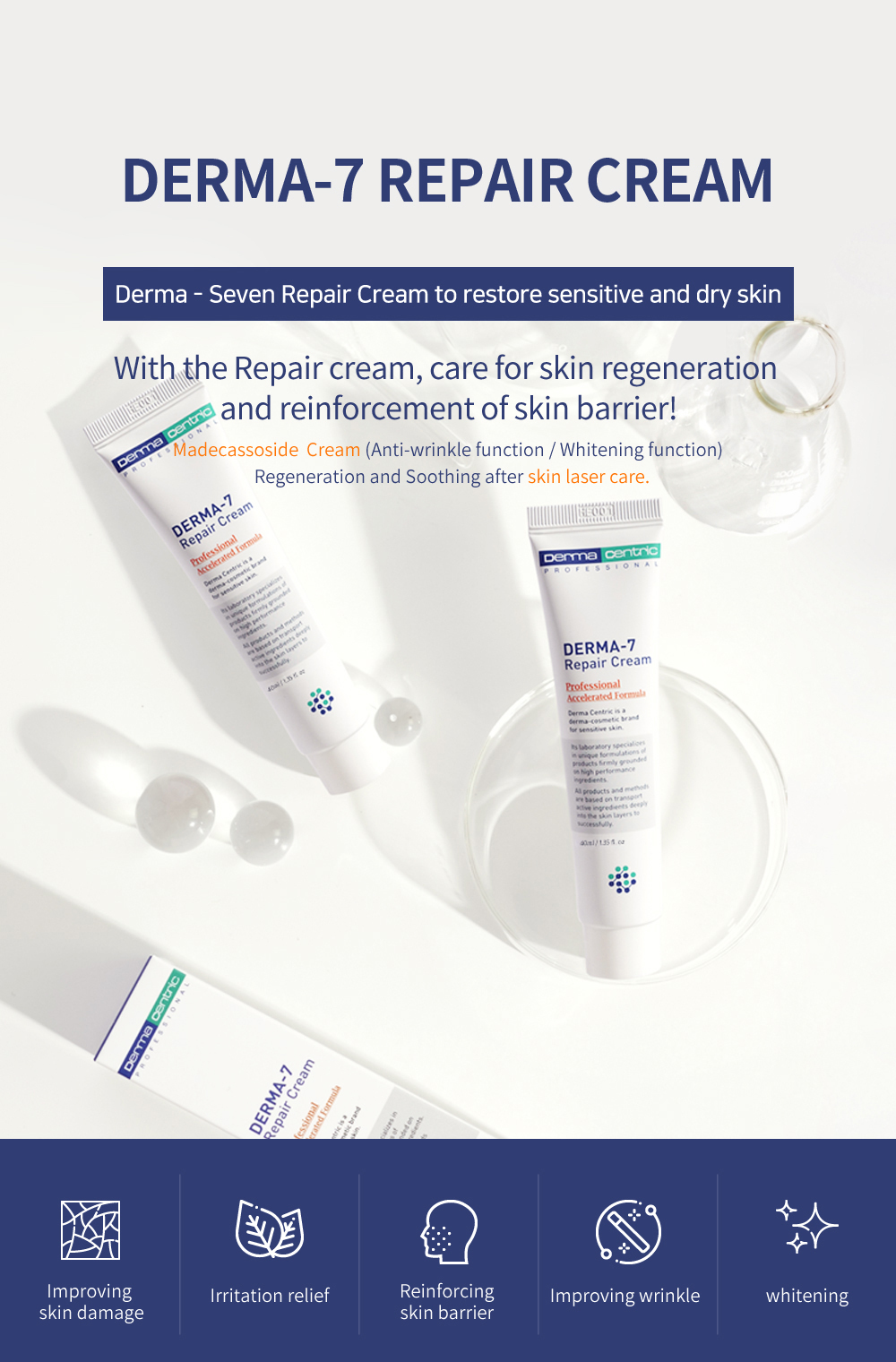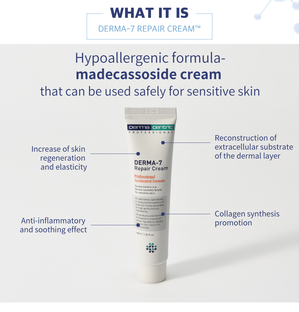 DERMA-7 REPAIR CREAM contains enough nutrients to restore and rejuvenate your skin. The active ingredients Madecassoside and Ceramide NP restore the barrier function and provide enhanced moisture to sensitive skin. Use after laser treatment to increase skin elasticity and soothe the skin.