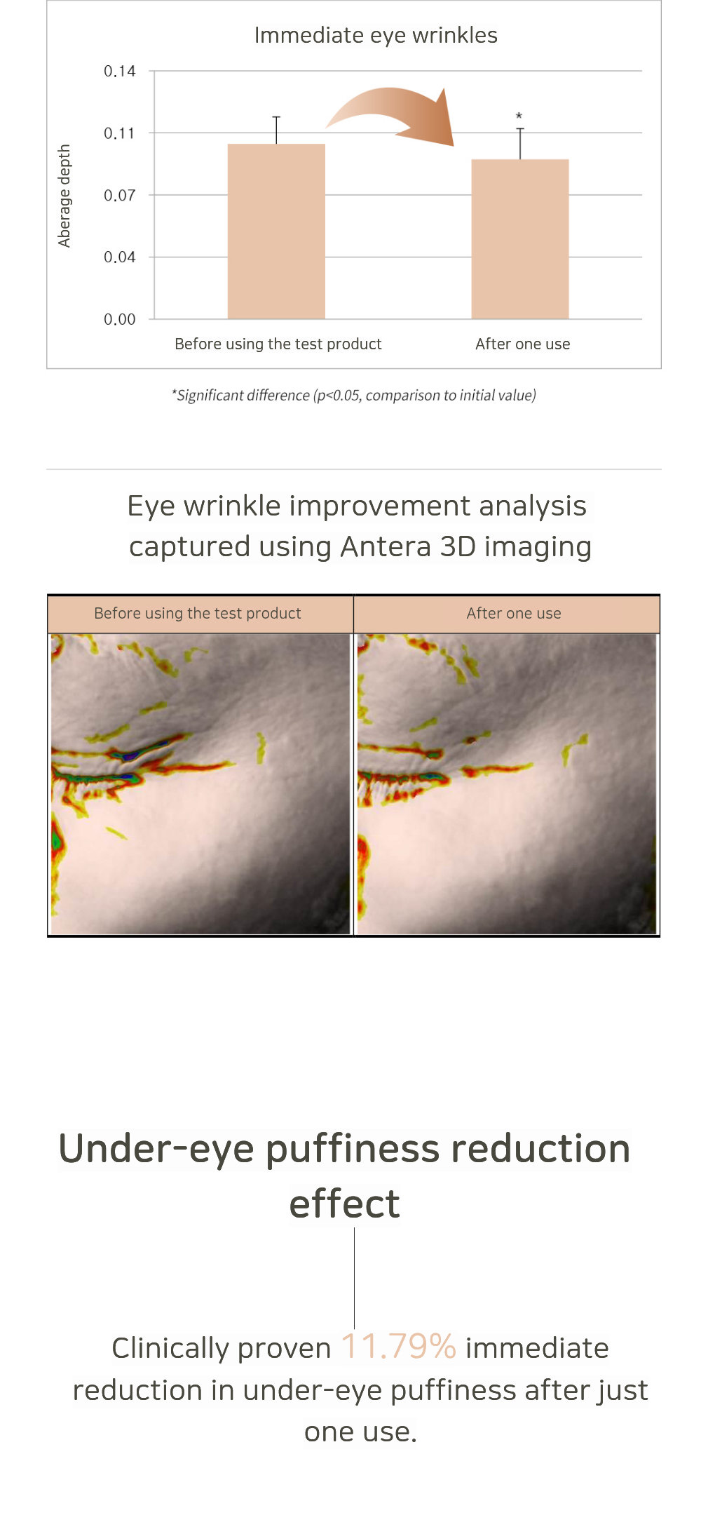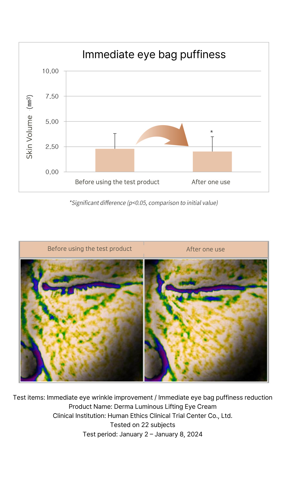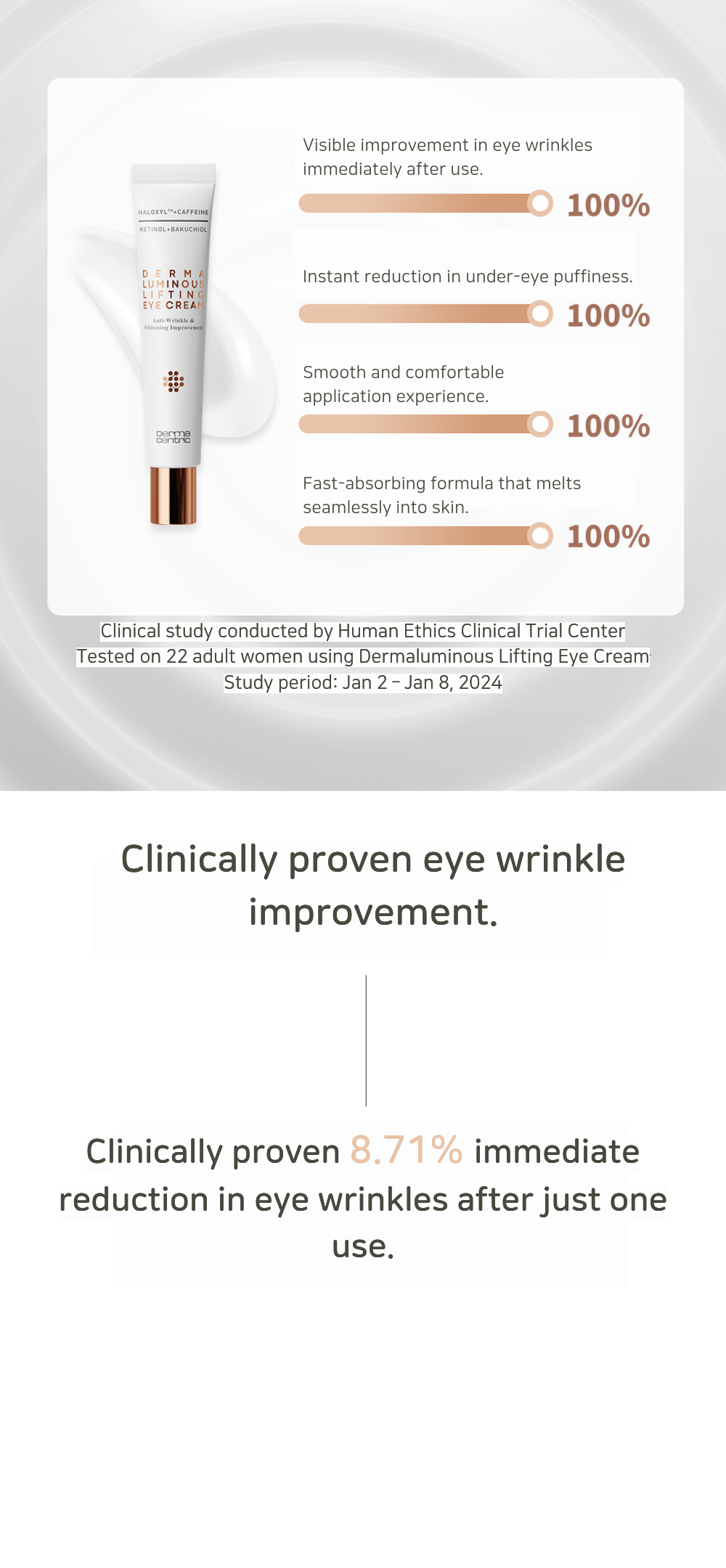 - Clinically proven to improve Eye wrinkles (8.71% after a single use)