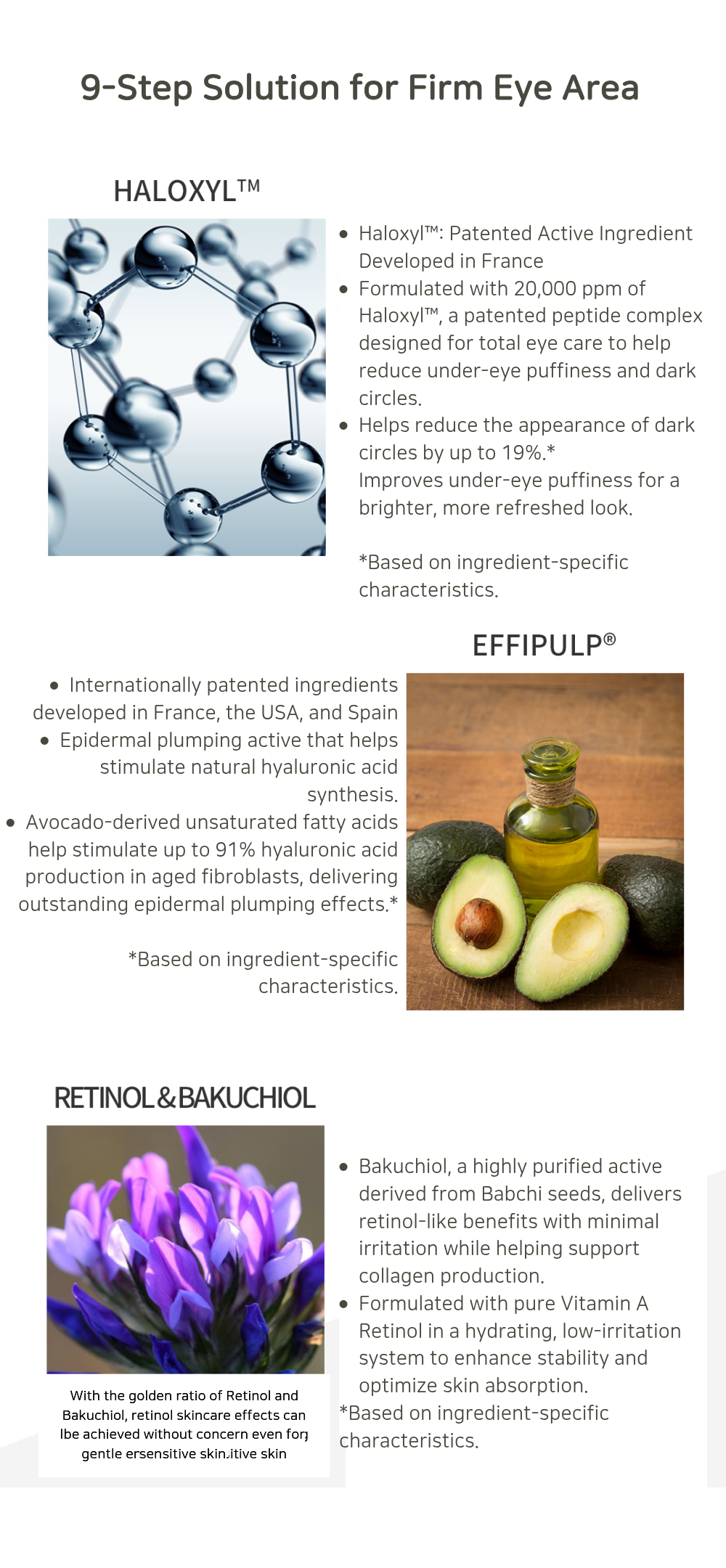 This premium eye cream contains two patented international ingredients-HALOXYLTM and EFFLPULP – along with Retinol and Bakuchiol, to visibly improve the elasticity, wrinkles, dark circles, and puffiness around the eyes after just one use.